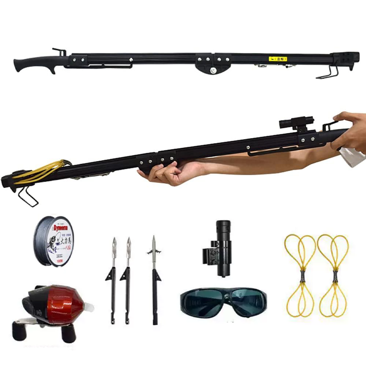 - Accessori inclusi: Fionda, mulinello da pesca, elastico, lenze da pesca, dardi da pesca, mirino per macchina