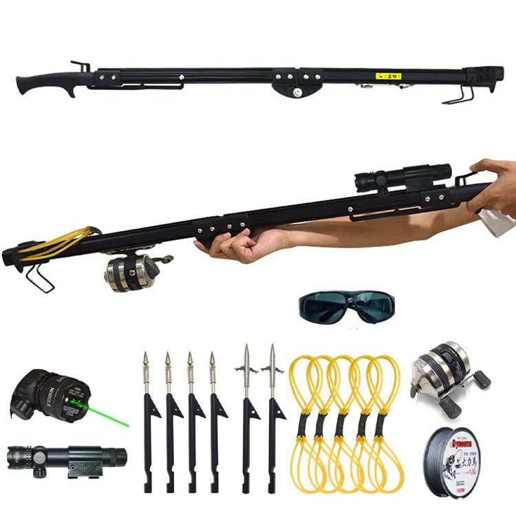 - Accessori inclusi: Fionda, mulinello da pesca, elastico, lenze da pesca, dardi da pesca, mirino per macchina